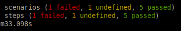 Em amarelo, Undefined, testes (cenários e/ou passos) os quais estão sendo cobertos por arquivos do tipo .feature (funcionalidade), porém cujos steps ainda estão pendentes de implementação.