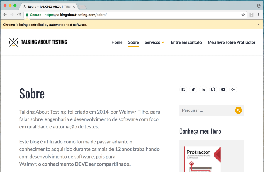 Caso você execute testes automatizados de UI no navegador Google Chorme, deve ter percebido que em sua versão mais recente (versão 57 na data de publicação deste post), durante a execução dos testes automatizados uma barra amarela é exibida no topo no navegador com a mensagem “Chrome is being controlled by automated test software”.