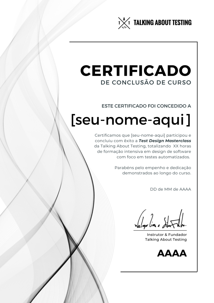 Para entrar na lista de espera, envie um e-mail para walmyr@talkingabouttesting.com com o seguinte título: [Lista de Espera – Test Design Masterclass – Talking About Testing]